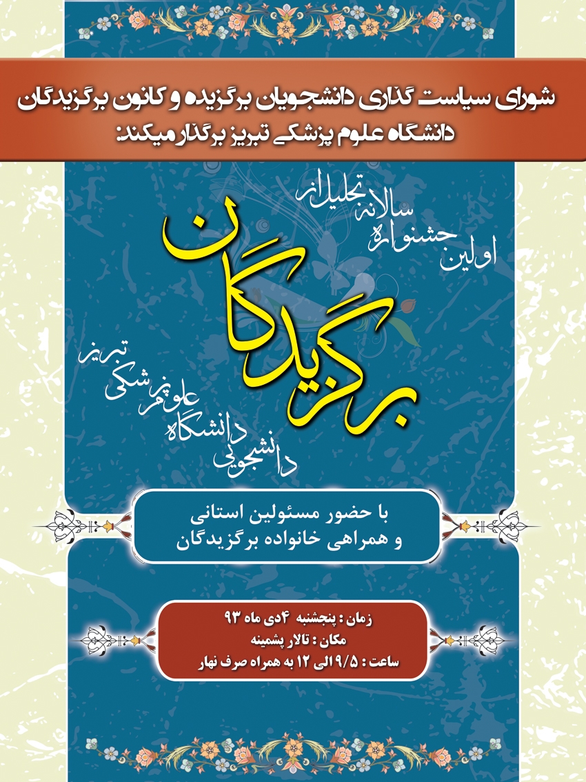اولین همایش تجلیل از برگزیدگان دانشگاه علوم پزشکی تبریز با رویکرد حمایت از برگزیدگان علمی، آموزشی، فرهنگی و ورزشی دانشگاه، با حمایت مستقیم ریاست محترم دانشگاه و زیر نظر معاونت تحقیقات و فناوری، معاونت آموزشی و معاونت فرهنگی دانشجویی دانشگاه و با حضور مسئولین استانی و همراهی خانواده های برگزیدگان دانشگاه برگزار خواهد شد. دانشجویان برگزیده ای که قرار است امسال در این مراسم از آنها تقدیر بعمل آید، بر اساس آیین نامه مصوب شورای سیاست گذاری برگزیدگان دانشگاه در دو سطح یک و دو قرار می گیرند.