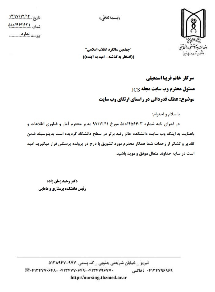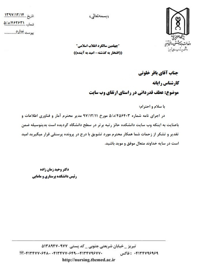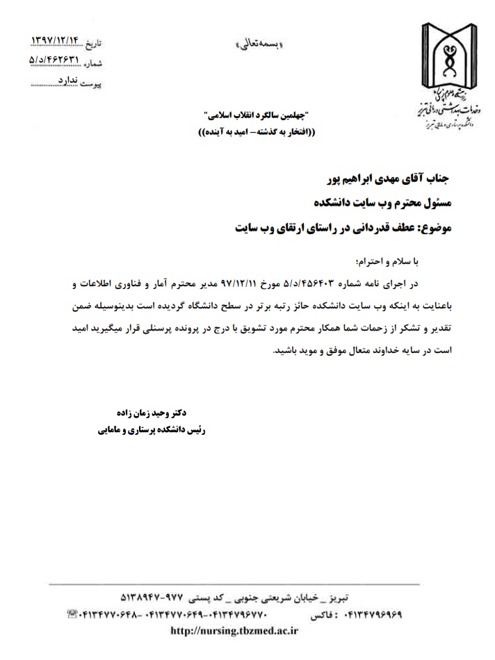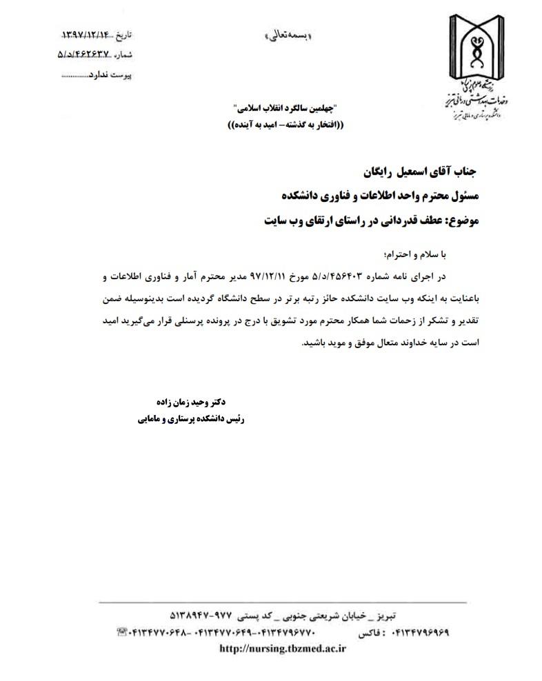 ریاست محترم دانشکده، جناب آقای دکتر زمان زاده به استناد کسب رتبه برتر وبسایت دانشکده در سطح دانشگاه از زحمات همکاران محترم واحد آی تی دانشکده تقدیر و تشکر نمودند.
