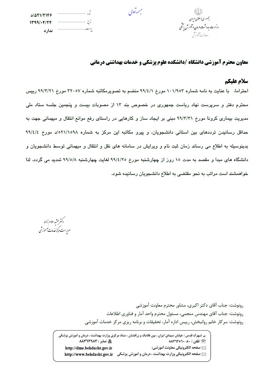 بر اساس اعلام سرپرست مرکز خدمات آموزشی وزارت بهداشت، زمان ثبت نام و ویرایش در سامانه های نقل و انتقال و میهمانی توسط دانشجویان و دانشگاه های مبدا و مقصد بمدت 15 روز از