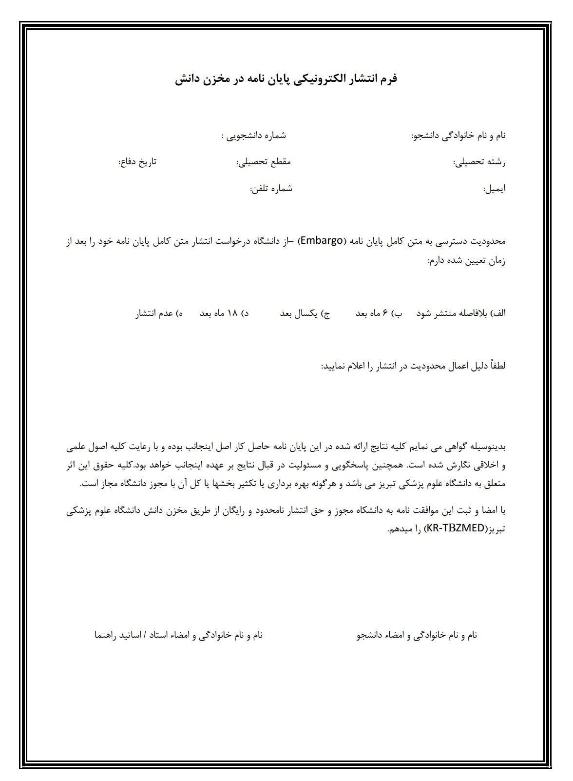 به اطلاع دانشجویان محترم می رساند "فرم انتشار الکترونیکی پایان نامه در مخزن دانش" در قسمت مربوط به فرم های کتابخانه در دسترس می باشد. (99/4/05)