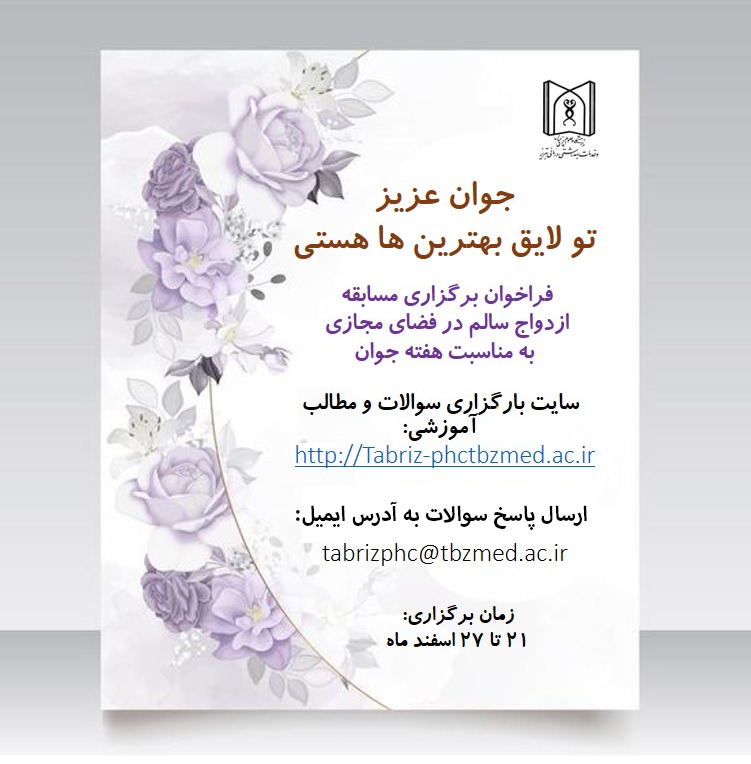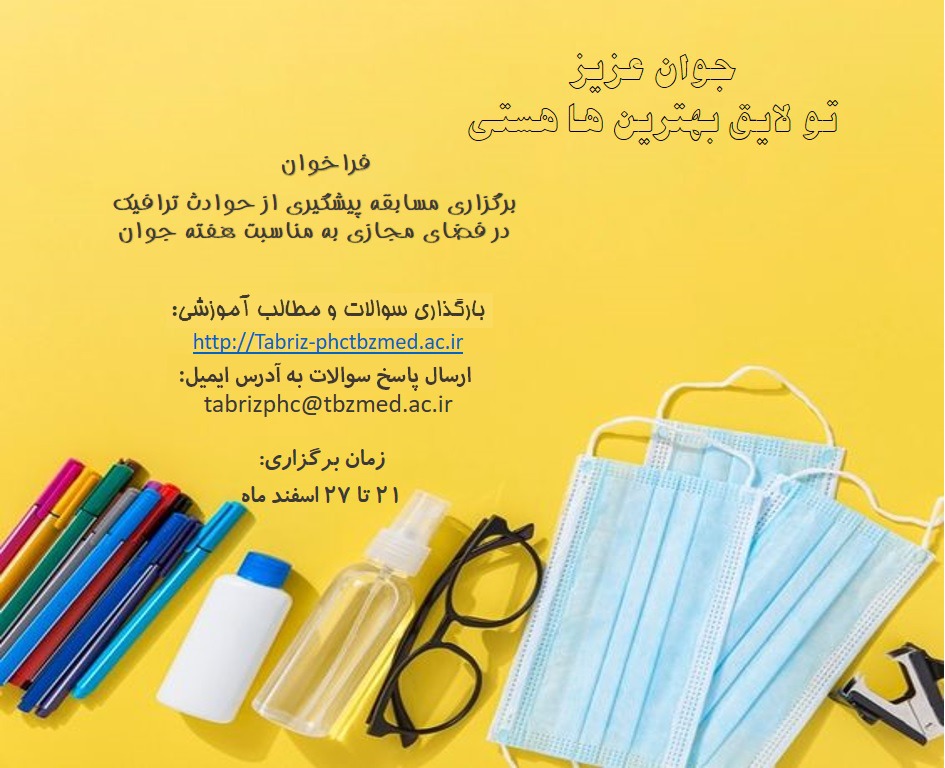 به اطلاع علاقمندان می رساند مرکز بهداشت شهرستان تبریز در نظر دارد بمناسبت سالروز تولد حضرت علی اکبر و هفته جوان، مسابقه کتابخوانی با موضوع «پیشگیری از حوادث ترافیکی» و «ازدواج سالم و پایدار» از 21 الی 27 اسفند برگزار نماید. لازم به توضیح است به آثار برتر جوایزی اهدا خواهد شد.