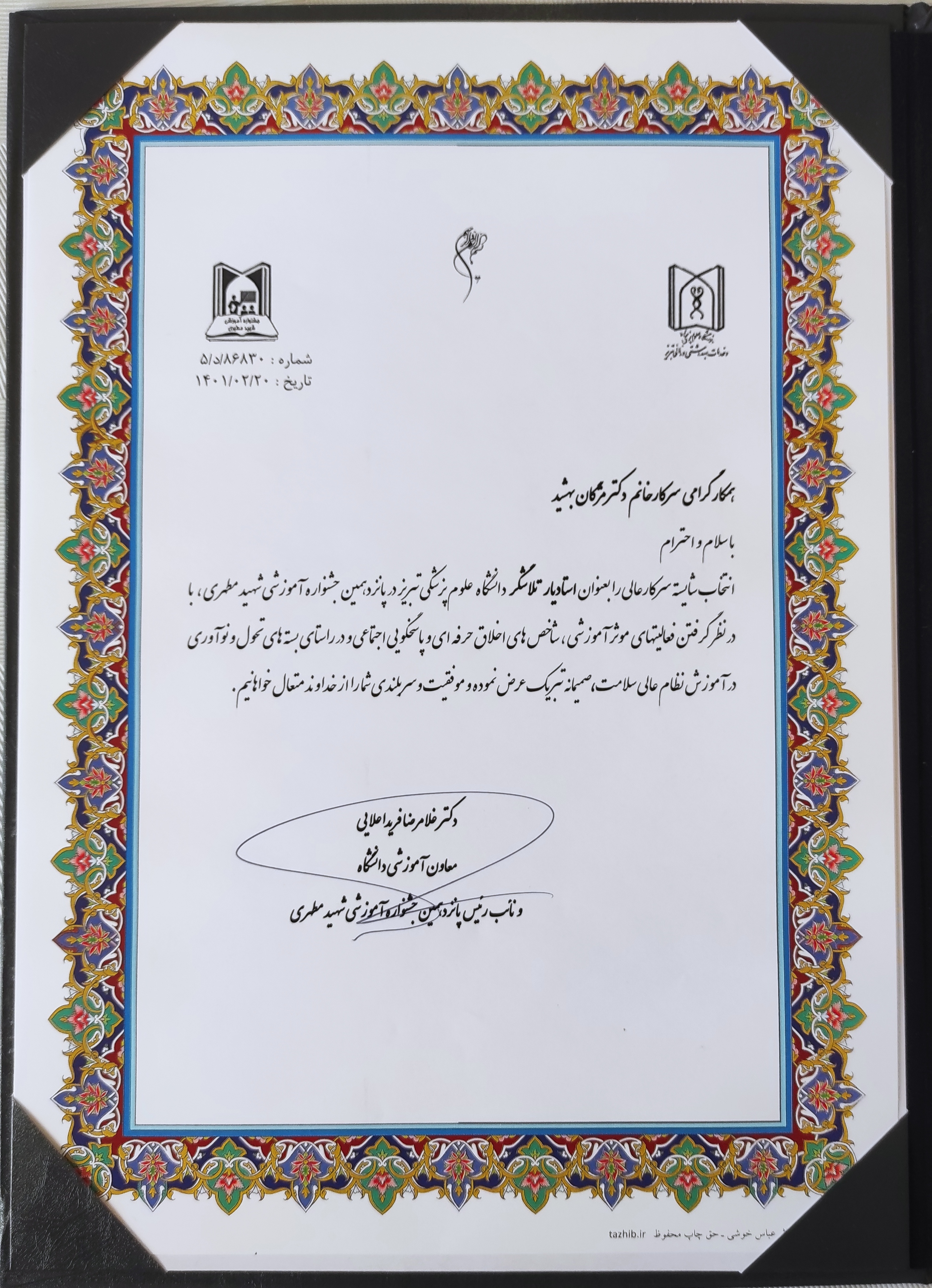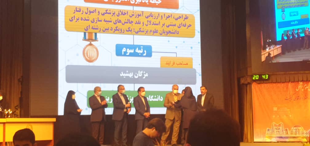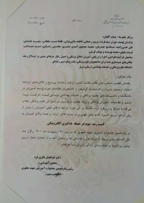 بدین وسیله کسب رتبه سوم در حیطه یادگیری الکترونیکی در پانزدهمین جشنواره کشوری شهید مطهری و همچنین کسب عنوان استادیار تلاشگر دانشگاه علوم پزشکی تبریز در پانزدهمین جشنواره آموزشی شهید مطهری دانشگاه، توسط سرکار خانم دکتر مژگان بهشید، عضو محترم هیات علمی گروه پرستاری داخلی جراحی را خدمت ایشان و همکاران محترم ایشان، خانواده محترمشان و کلیه کارکنان و دانشجویان گرامی دانشکده تبریک و تهنیت عرض نموده، توفیق روزافزونشان را از درگاه خداوند منان خواستاریم.