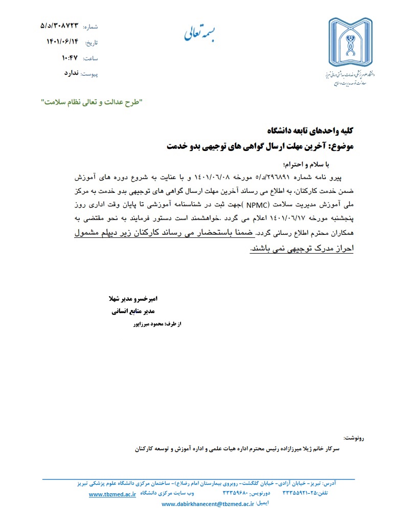 بر اساس اعلام مدیر منابع انسانی دانشگاه، آخرین مهلت ارسال گواهی های توجیهی بدو خدمت به مرکز ملی آموزش مدیریت سلامت (NPMC) جهت ثبت در شناسنامه آموزشی تا پایان وقت اداری روز پنجشنبه مورخه 17 شهریور 1401 اعلام گردید.