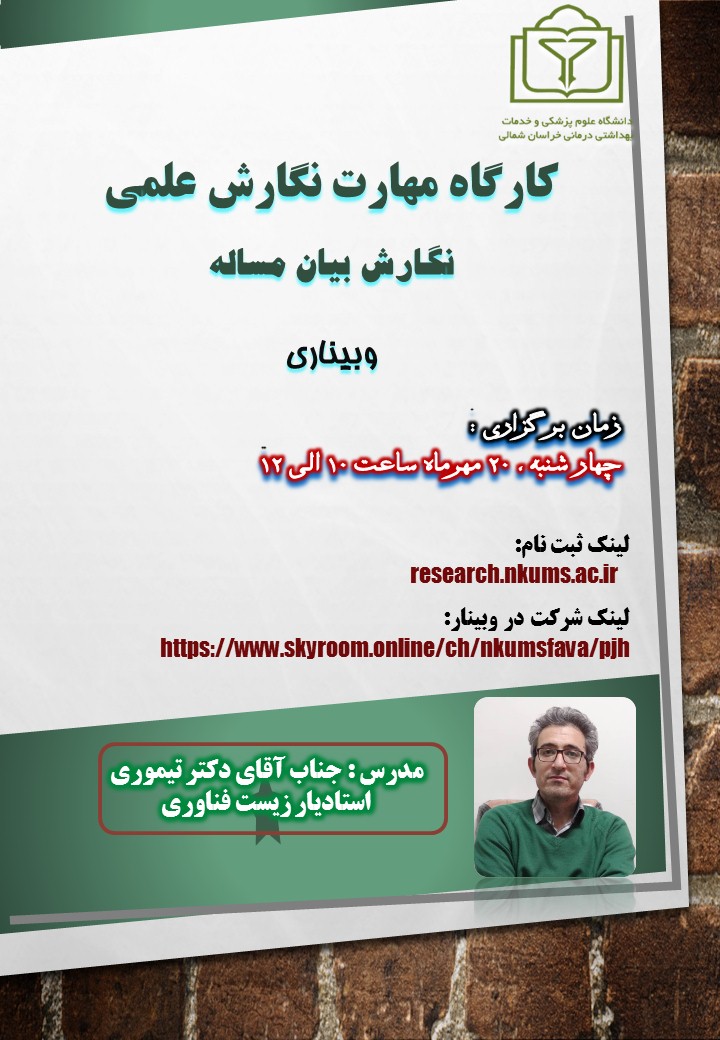 به اطلاع علاقمندان میرساند دانشگاه علوم پزشکی خراسان شمالی، کارگاه «مهارت نگارش علمی؛ نگارش بیان مساله» را مورخه 20 مهر از ساعت 10 الی 12 در بستر اسکای روم برگزار خواهد کرد.