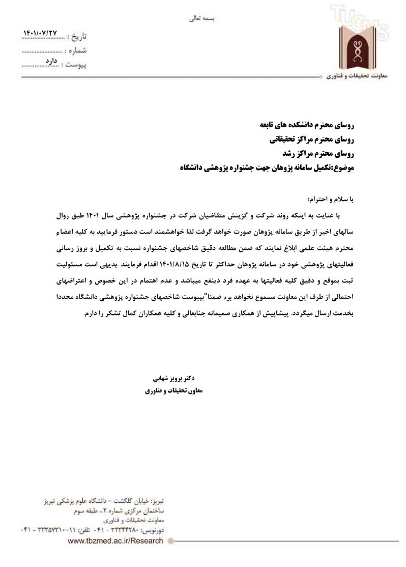 بنا بر اعلام معاون تحقیقات و فناوری دانشگاه علوم پزشکی تبریز، با عنایت به اینکه روند شرکت و گزینش متقاضیان شرکت در جشنواره پژوهشی سال 1401 طبق روال سالهای اخیر از طریق سامانه پژوهان صورت خواهد گرفت، ضروری است کلیه اعضای محترم هیات علمی نسبت به تکمیل و بروز رسانی فعالیتهای پژوهشی خود در این سامانه تا مورخ 15 آبان 1401 اقدام نمایند. جهت دریافت فایل شاخصهای جشنواره،