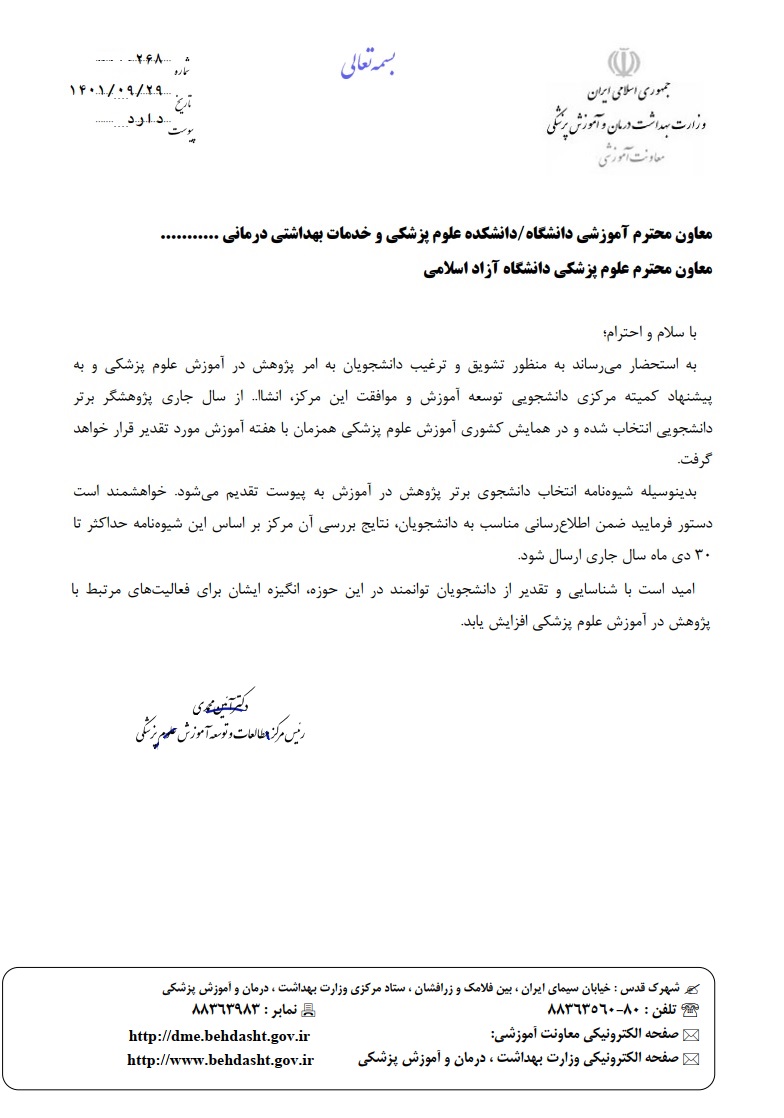 بنا بر اعلام رئیس مرکز مطالعات و توسعه آموزش علوم پزشکی وزارت بهداشت، به منظور تشویق و ترغیب دانشجویان به امر پژوهش در آموزش علوم پزشکی شیوه نامه انتخاب پژوهشگر برتر دانشجویی در حیطه آموزش پزشکی انتشار یافت. جهت دریافت فایل شیوه نامه،