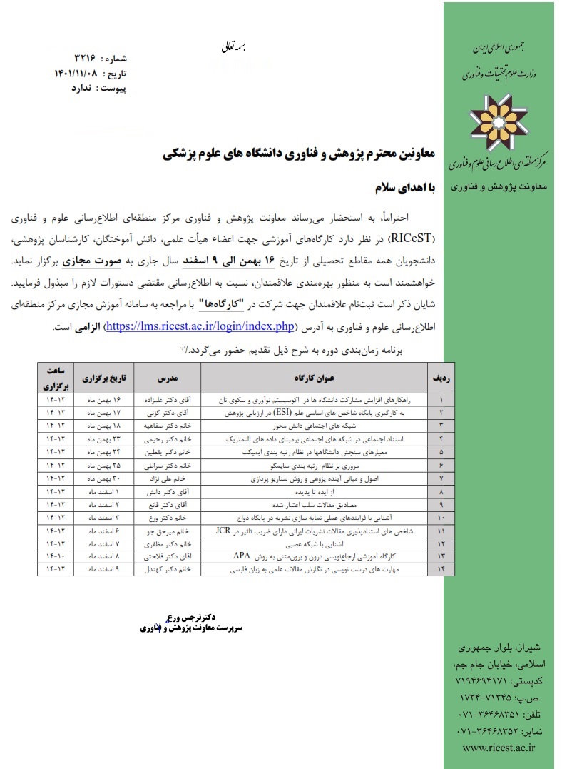 بنابر اعلام سرپرست معاونت پژوهش و فناوری مرکز منطقه ای اطلاع رسانی علوم و فناوری وزات علوم، این مرکز در نظر دارد کارگاه های آموزشی از تاریخ 16 بهمن الی 9 اسفند سال جاری (1401) بصورت مجازی برگزار نماید.
