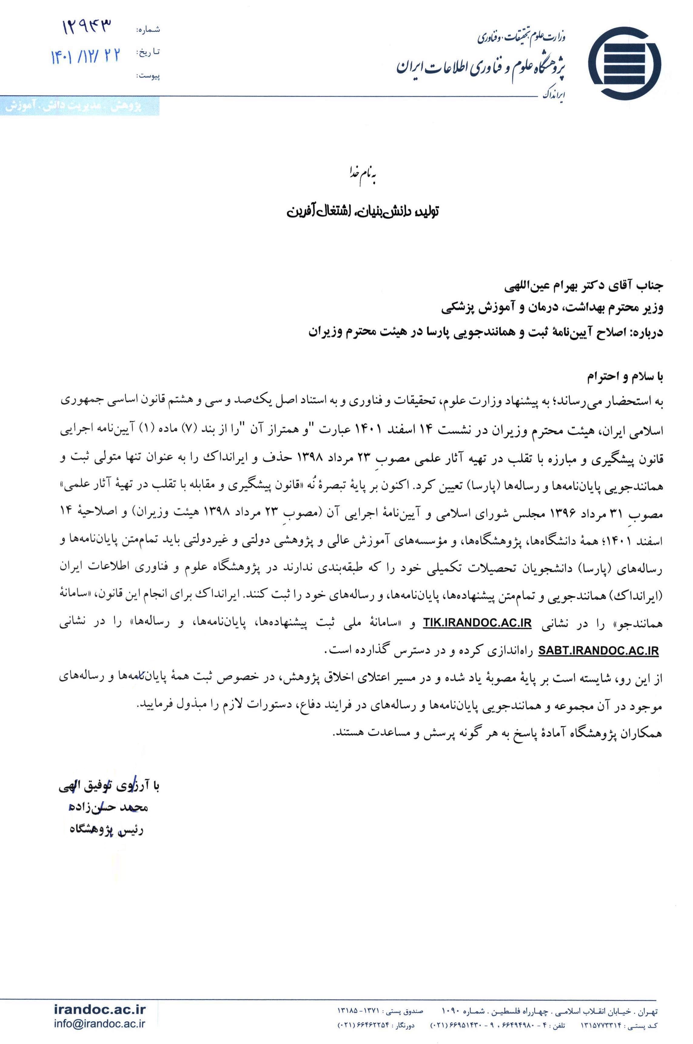بنابر اعلام رئیس پژوهشگاه علوم و فناوری اطلاعات ایران (ایرانداک) به پیشنهاد وزارت علوم، تحقیقات و فناوری، این پژوشگاه بعنوان تنها متولی ثبت و همانندجویی پایان نامه ها و رساله ها (پارسا) تعیین گردیده است.