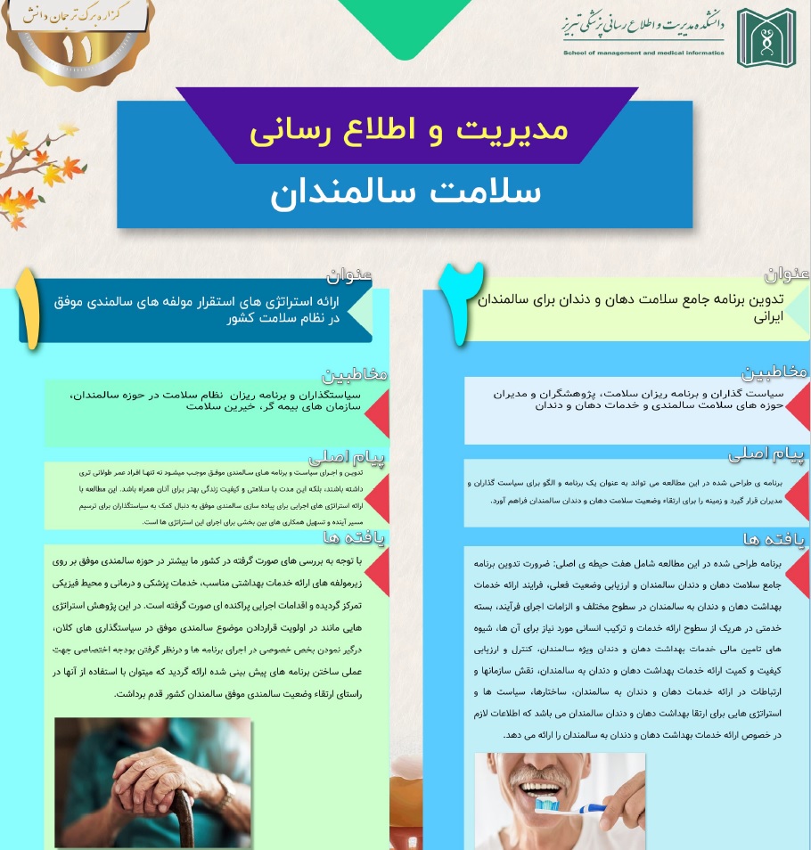 یازدهمین شماره گزاره برگ کمیته ترجمان دانش دانشکده مدیریت و اطلاع رسانی پزشکی با عنوان "سلامت سالمندان" که مستخرج از 4 مطالعه انجام گرفته توسط همکاران دانشکده مدیریت و اطلاع رسانی پزشکی میباشد، انتشار یافت. جهت دریافت فاین گزاره برگ، بر رو تصویر کلیک نمائید.