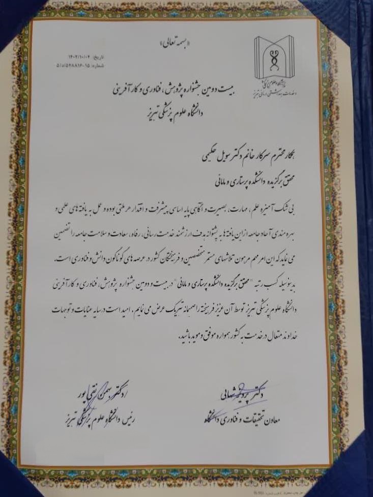 بدین وسیله انتخاب سرکار خانم دکتر سویل حکیمی (عضو هیات علمی گروه مامایی) دانشکده بعنوان محقق برگزیده دانشکده پرستاری و مامائی در بیست و دومین جشنواره پژوهش، فناوری و کارآفرینی دانشگاه علوم پزشکی تبریز را به ایشان، خانواده محترم ایشان و کلیه همکاران و دانشجویان گرامی دانشکده تبریک و تهنیت عرض نموده، توفیق روزافزونشان را از درگاه داوند منان خواستاریم.