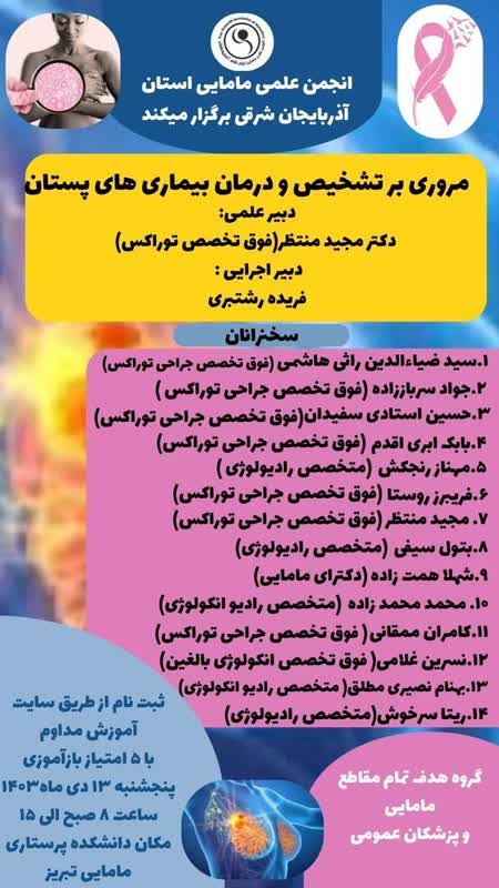 به گزارش روابط عمومی دانشکده پرستاری و مامائی تبریز، کنفرانس علمی یک روزه «مروری برتشخیص و درمان بیماریهای پستان» به همت انجمن علمی مامائی استان روز پنجشنبه مورخ 13 دی ماه 1403 از ساعت 5 الی 15 در تالار علامه طباطبائی دانشکده پرستاری و مامائی تبریز برگزار خواهد گردید.