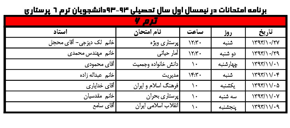 برنامه امتحانی کارشناسی پرستاری ترم 6 (نیمسال اول 94-93)